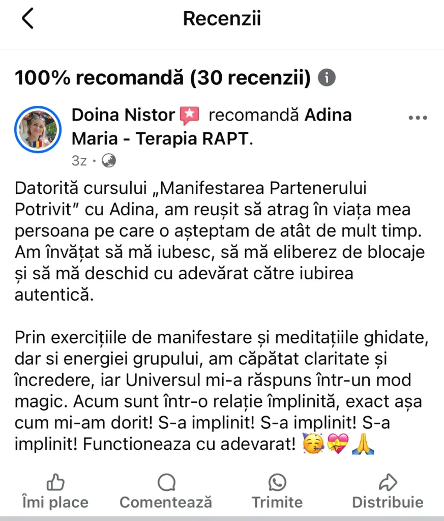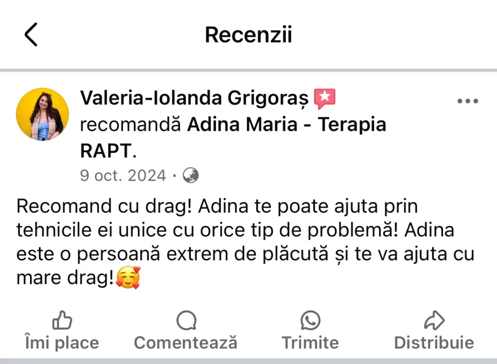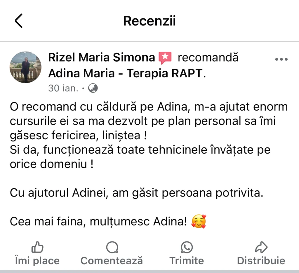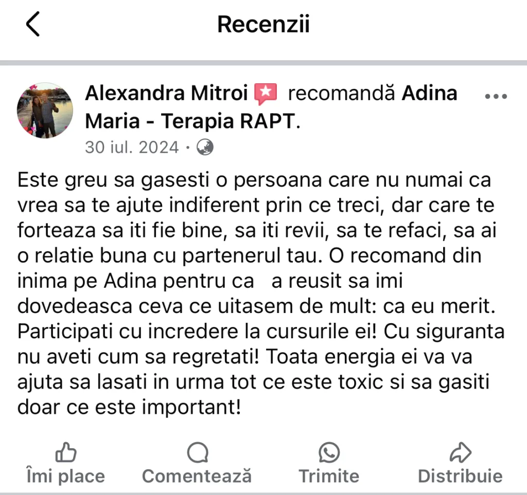 Toate astea m-au ajutat enorm… dar parcă lipsea ceva. Un fir care să le unească. După ani de căutări, dureri și revelații, am pus cap la cap tot ce am învățat din propria viață, din formările mele și din munca cu sute de oameni. Și așa s-a născut metoda RAPT – Reprogramarea ADN-ului Psihologic Transmis.